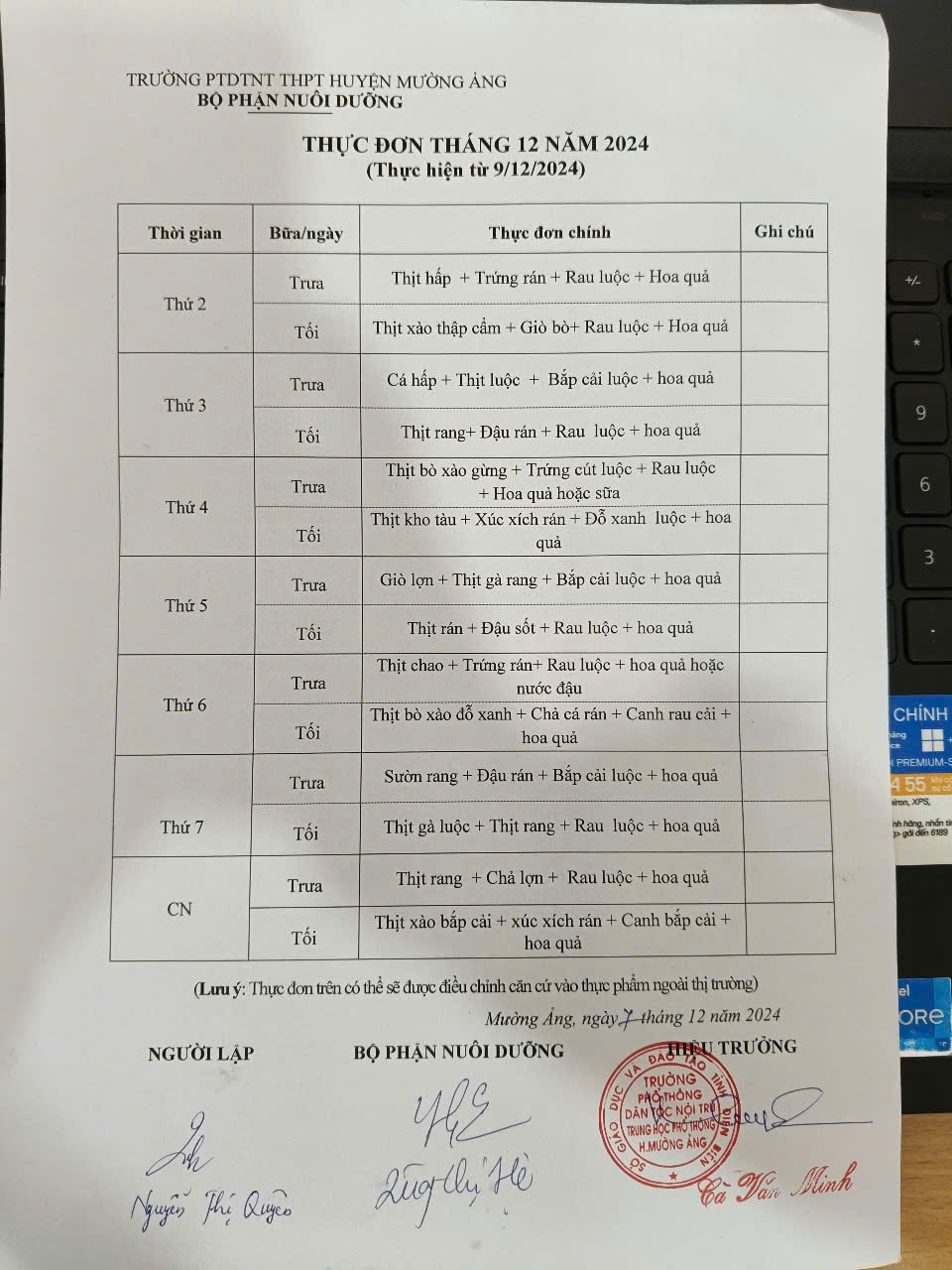 Thực đơn tháng 12 năm 2024 (Tuần 13)