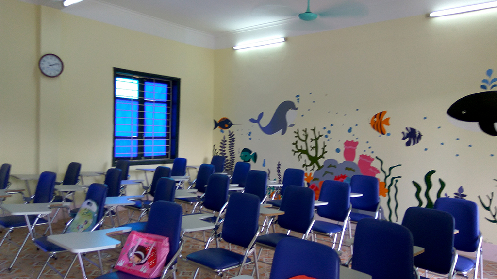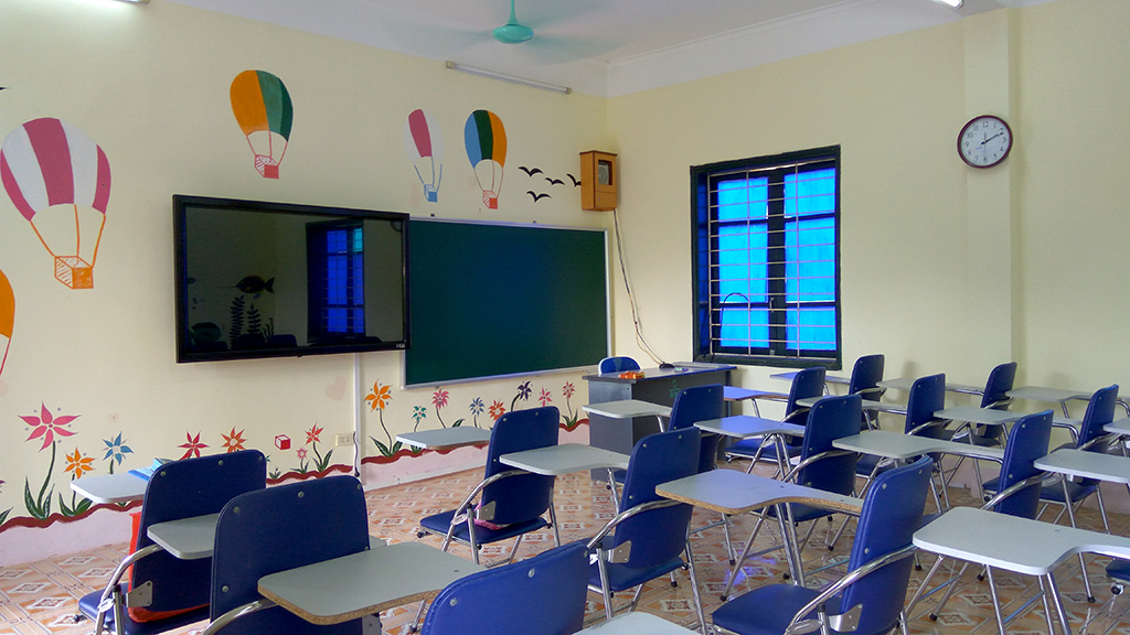 Phòng học thoáng mát, hiện đại được trang bị tivi cảm ứng đa điểm kết hợp hệ thống âm thanh hiện đại.